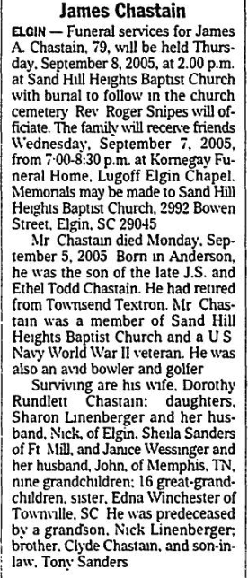 Surviving are his wife, Dorothy Rundlett Chastain; daughters, Sharon Linenberger and her husband, Nick, of Elgin, Sheila Sanders of Ft. Mill, and Janice Wessinger and her husband, John, of Memphis, TN; nine grandchildren; 16 great-grandchildren; sister, Edna Winchester of Townville, SC.