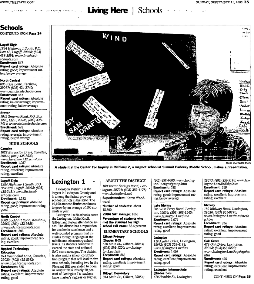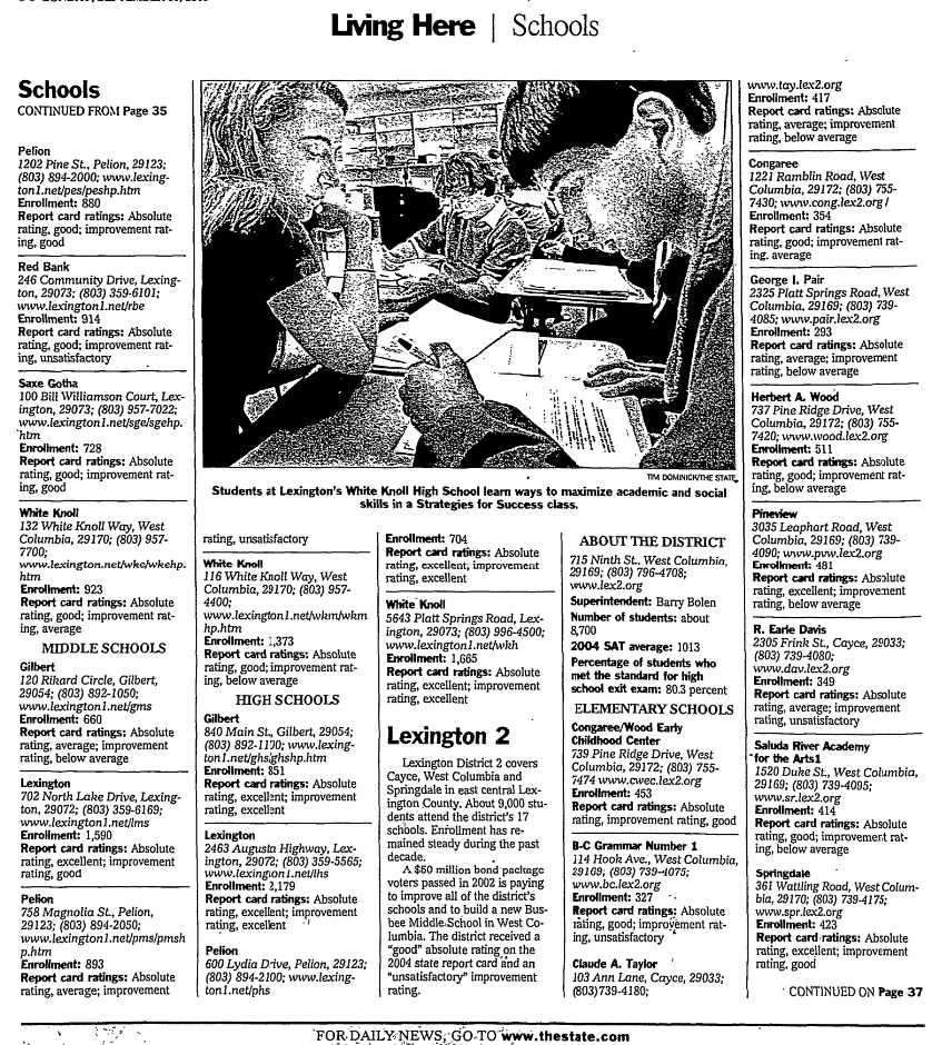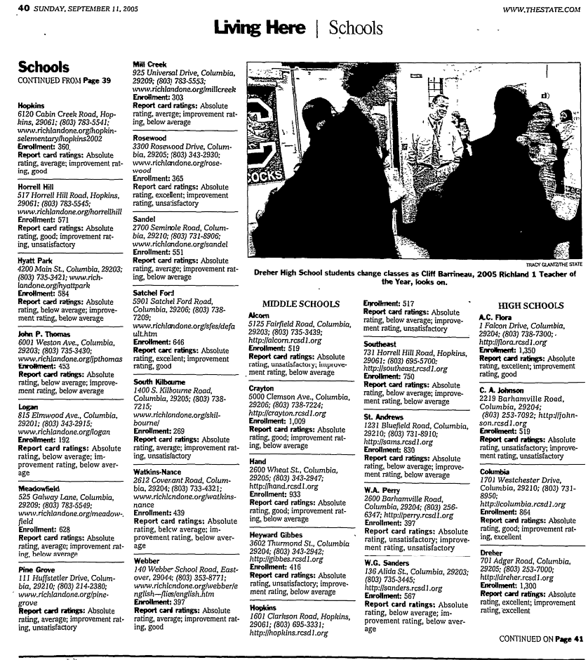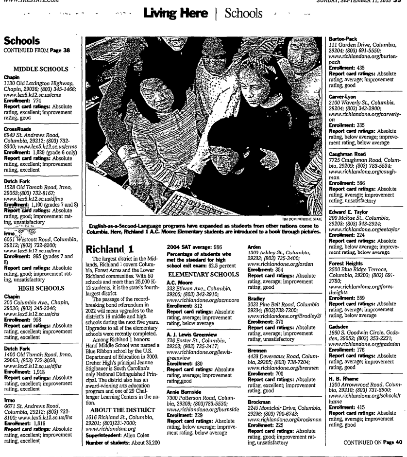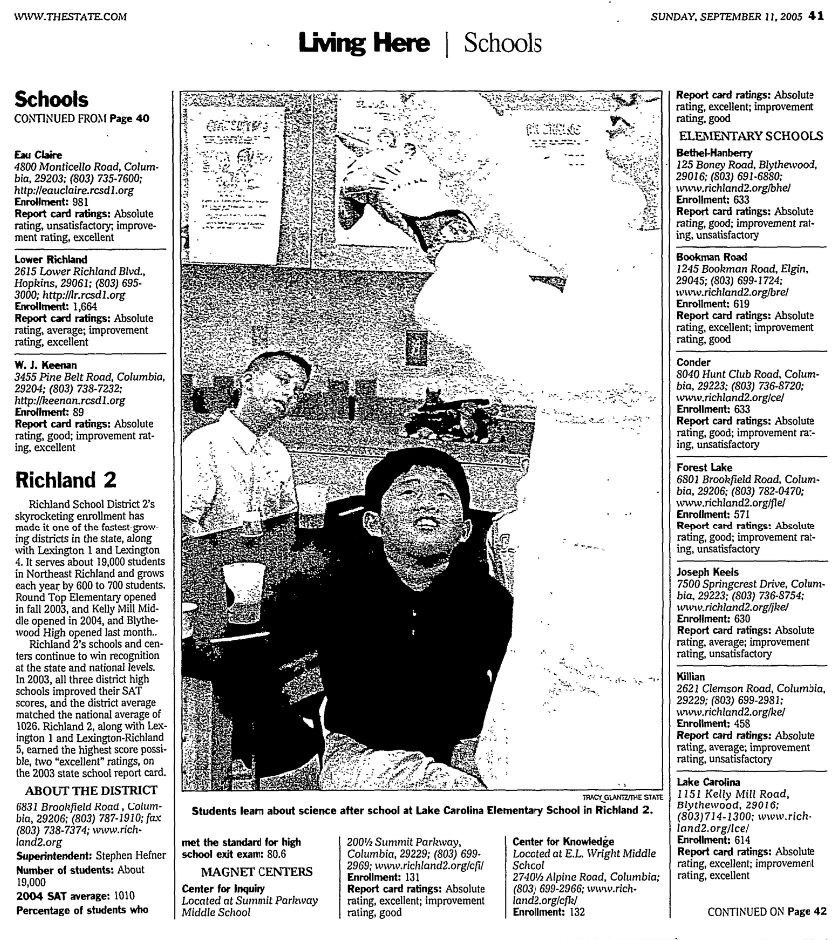 Richland School District 2’s skyrocketing enrollment has made it one of the fastest-growing districts in the state, along with Lexington 1 and Lexington 4. It serves about 19,000 students in Northeast Richland and grows each year by 600 to 700 students. Round Top Elementary opened in fall 2003, and Kelly Mill Middle opened in 2004, and Blythewood High opened last month..