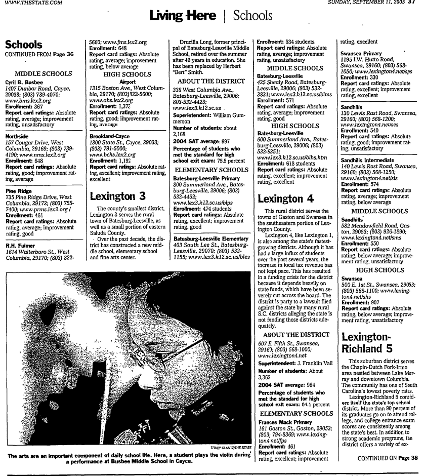 Lexington 1’s 20 schools serve the Lexington, White Knoll, Gilbert and Pelion attendance areas. The district has a reputation for academic excellence and a well-rounded program that includes foreign language at the middle and elementary school levels. Its students continue to exceed the state and national SAT score averages. The district is also amid a school construction program that will lead to five new schools, including two in the Pleasant Hill area slated to open in August 2006. Nearly 70 percent of Lexington 1’s teachers have master’s degrees or higher.