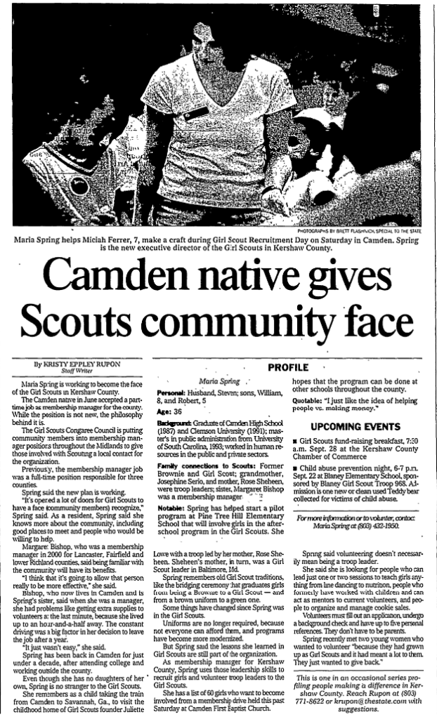 She remembers as a child taking the train from Camden to Savannah, Ga., to visit the childhood home of Girl Scouts founder Juliette Lowe with a troop led by her mother, Rose Sheheen. Sheheen’s mother, in turn, was a Girl Scout leader in Baltimore, Md.