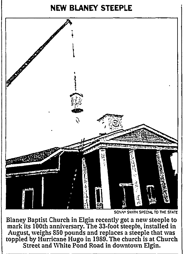Blaney Baptist Church in Elgin recently got a new steeple to mark its 100th anniversary. The 33-foot steeple, installed in August, weighs 850 pounds and replaces a steeple that was toppled by Hurricane Hugo in 1989. The church is at Church Street and White Pond Road in downtown Elgin. SONNY SMITH/SPECIAL TO THE STATE