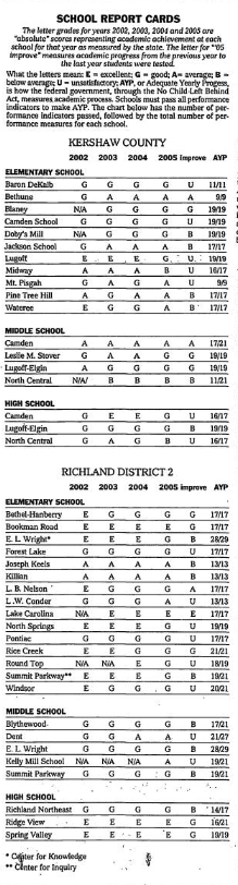 The letter grades for years 2002, 2003, 2004 and 2005 are “absolute” scores representing academic achievement at each school for that year as measured by the state.