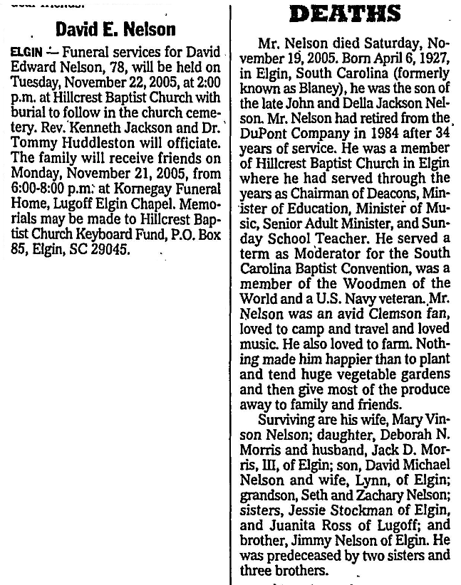 Mr. Nelson died Saturday, November 19, 2005. Born April 6, 1927, in Elgin, South Carolina (formerly known as Blaney), he was the son of the late John Nelson and Della Jackson Nelson. Mr. Nelson had retired from the DuPont Company in 1984 after 34 years of service. He was a member of Hillcrest Baptist Church in Elgin where he had served through the years as Chairman of Deacons, Minister of Education, Minister of Music, Senior Adult Minister, and Sunday School Teacher. He served a term as Moderator for the South Carolina Baptist Convention, was a member of the Woodmen of the World and a U.S. Navy veteran. Mr. Nelson was an avid Clemson fan, loved to camp and travel and loved music. He also loved to farm. Nothing made him happier than to plant and tend huge vegetable gardens and then give most of the produce away to family and friends.