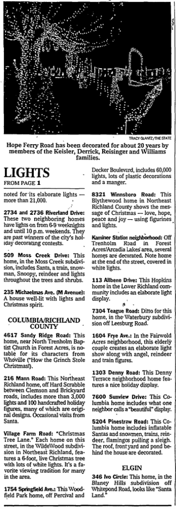 Kaminer Station neighborhood: Off Trenholm Road in Forest Acres/Arcadia Lakes area, several homes are decorated. Note home at the end of the street, covered in white lights.