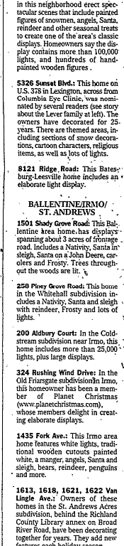 324 Rushing Wind Drive: In the Old Friarsgate subdivision in Irmo, this homeowner has been a member of Planet Christmas (www.planetchristmas.com), whose members delight in creating elaborate displays.