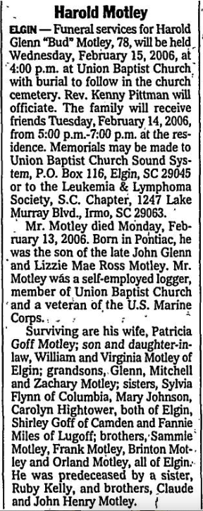 ELGIN – Funeral services for Harold Glenn “Bud” Motley, 78, will be held Wednesday, February 15, 2006, at 4:00 p.m. at Union Baptist Church with burial to follow in the church cemetery. Rev. Kenny Pittman will officiate. The family will receive friends Tuesday, February 14, 2006, from 5:00 p.m.-7:00 p.m. at the residence. Memorials may be made to Union Baptist Church Sound System, P.O. Box 116, Elgin, SC 29045 or to the Leukemia & Lymphoma Society, S.C. Chapter, 1247 Lake Murray Blvd., Irmo, SC 29063.