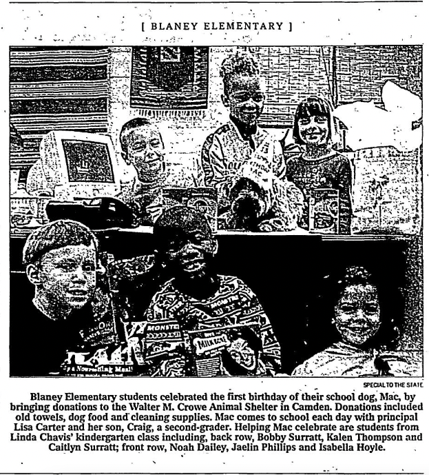 PHOTO: BW Blaney Elementary students celebrated the first birthday of their school dog, Mac, by bringing donations to the Walter M. Crowe Animal Shelter in Camden. Donations included old towels, dog food and cleaning supplies. Mac comes to school each day with principal Lisa Carter and her second-grade son, Craig. Helping Mac celebrate are students from Linda Chavis’ kindergarten class including, back row, Bobby Surratt, Kalen Thompson, Caitlyn Surratt; front row, Noah Dailey, Jaelin Phillips and Isabella Hoyle. SPECIAL TO THE STATE