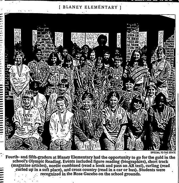 Fourth- and fifth graders at Blaney Elementary had the opportunity to go for the gold in the school’s Olympic Reading. Events including figure reading (biographies), short track (magazine articles), nordic combined (read a book and pass an AR test), curling (read curled up in a soft place), and cross country (read in a car or bus). Students were recognized in the Rose Gazebo on the school grounds.