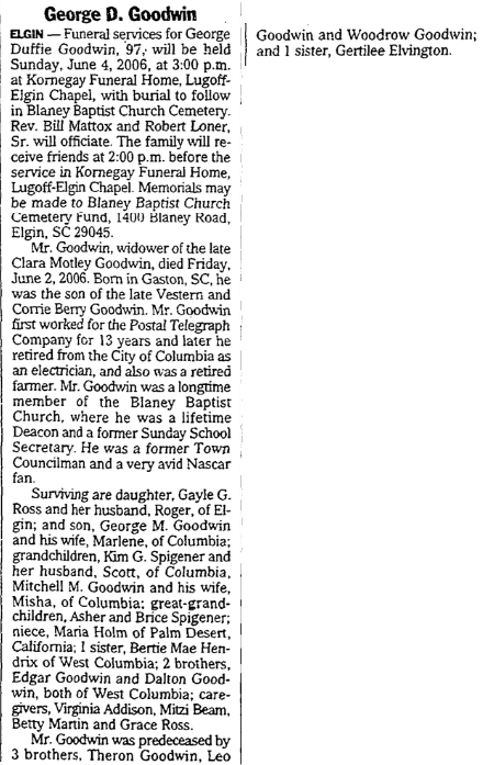 Mr. Goodwin, widower of the late Clara Motley Goodwin, died Friday, June 2, 2006. Born in Gaston, SC, he was the son of the late Vestern Goodwin and Corrie Berry Goodwin. Mr. Goodwin first worked for the Postal Telegraph Company for 13 years and later he retired from the City of Columbia as an electrician, and also was a retired farmer. Mr. Goodwin was a longtime member of the Blaney Baptist Church, where he was a lifetime Deacon and a former Sunday School Secretary. He was a former Town Councilman and a very avid Nascar fan.