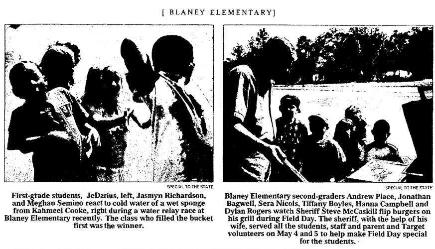 Blaney Elementary second-graders Andrew Place, Jonathan Bagwell, Sera Nicols, Tiffany Boyles, Hanna Campbell and Dylan Rogers watch Sheriff Steve McCaskill flip burgers on his grill during Field Day. The sheriff, with the help of his wife, served all the students, staff and parent and Target volunteers on May 4 and 5 to help make Field Day special for the students.