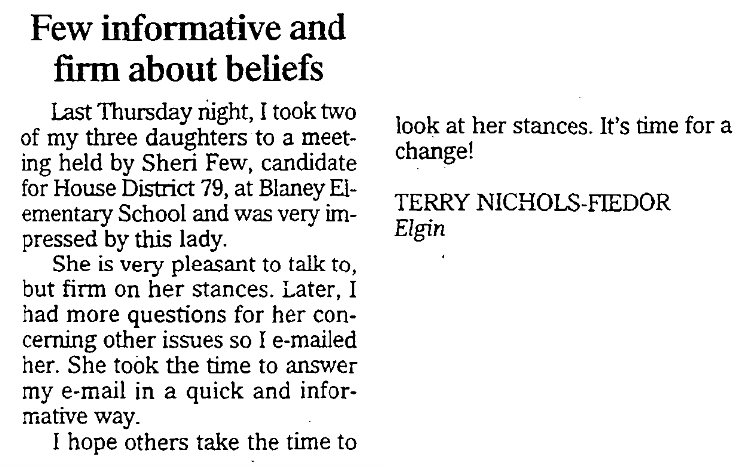 Last Thursday night, I took two of my three daughters to a meeting held by Sheri Few, candidate for House District 79 at Blaney Elementary School and was very impressed by this lady. She is very pleasant to talk to but firm on her stances. Later, I had more questions for her concerning other issues so I e-mailed her. She took the time to answer my e-mail … Continue reading FEW INFORMATIVE AND FIRM ABOUT BELIEFS