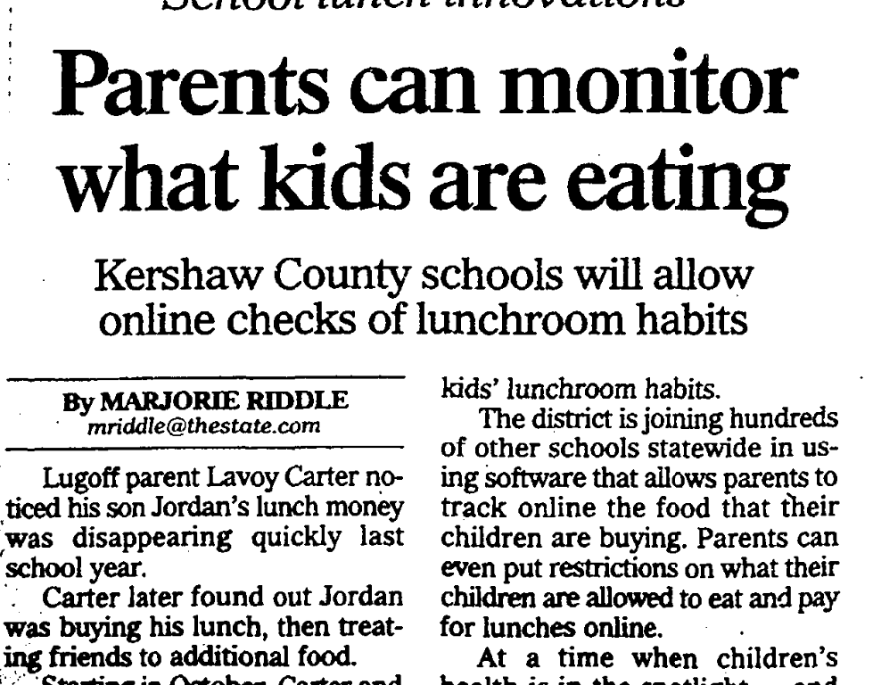 Starting in October, Carter and other Kershaw County parents will have a new way to monitor their kids’ lunchroom habits.