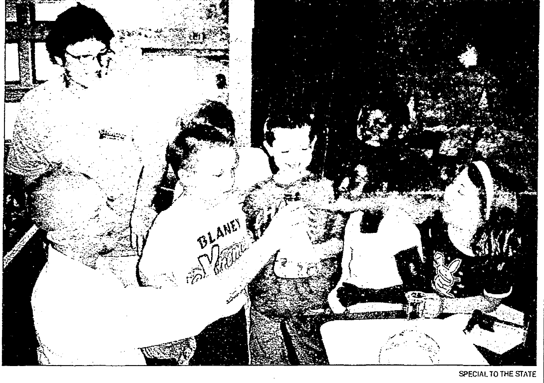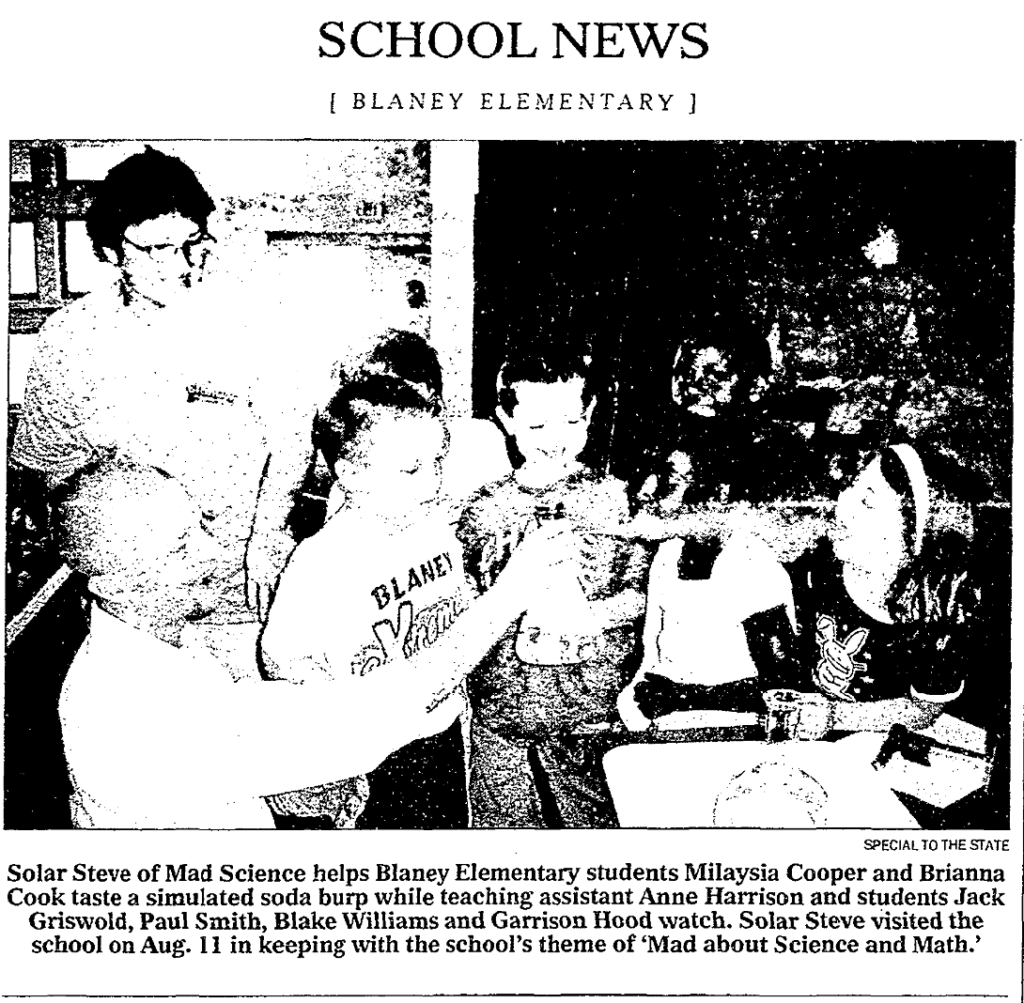 Solar Steve of Mad Science helps Blaney Elementary students Milaysia Cooper and Brianna Cook taste a simulated soda burp while teaching assistant Anne Harrison and students Jack Griswold, Paul Smith, Blake Williams and Garrison Hood watch. Solar Steve visited the school on Aug. 11 in keeping with the school’s theme of ‘Mad about Science and Math.’