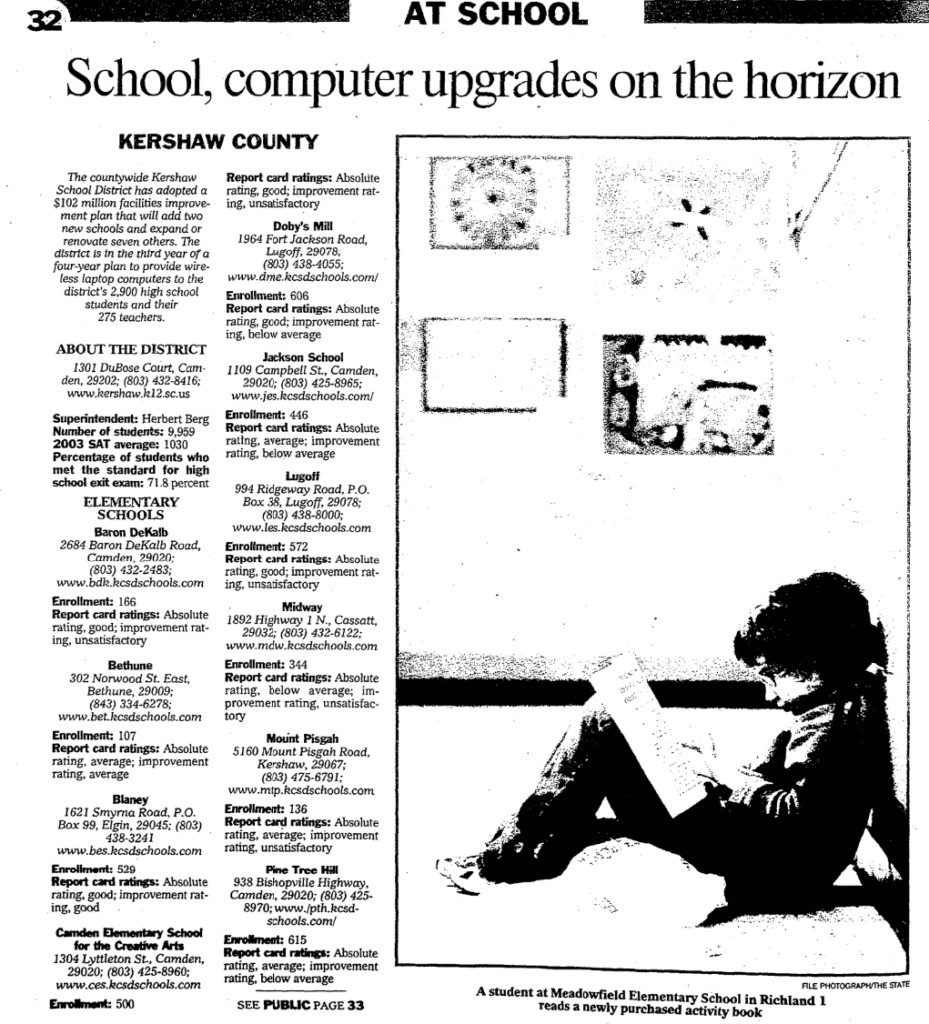 The countywide Kershaw School District has adopted a $102 million facilities improvement plan that will add two new schools and expand or renovate seven others. The district is in the third year of a four-year plan to provide wireless laptop computers to the district’s 2,900 high school students and their 275 teachers.