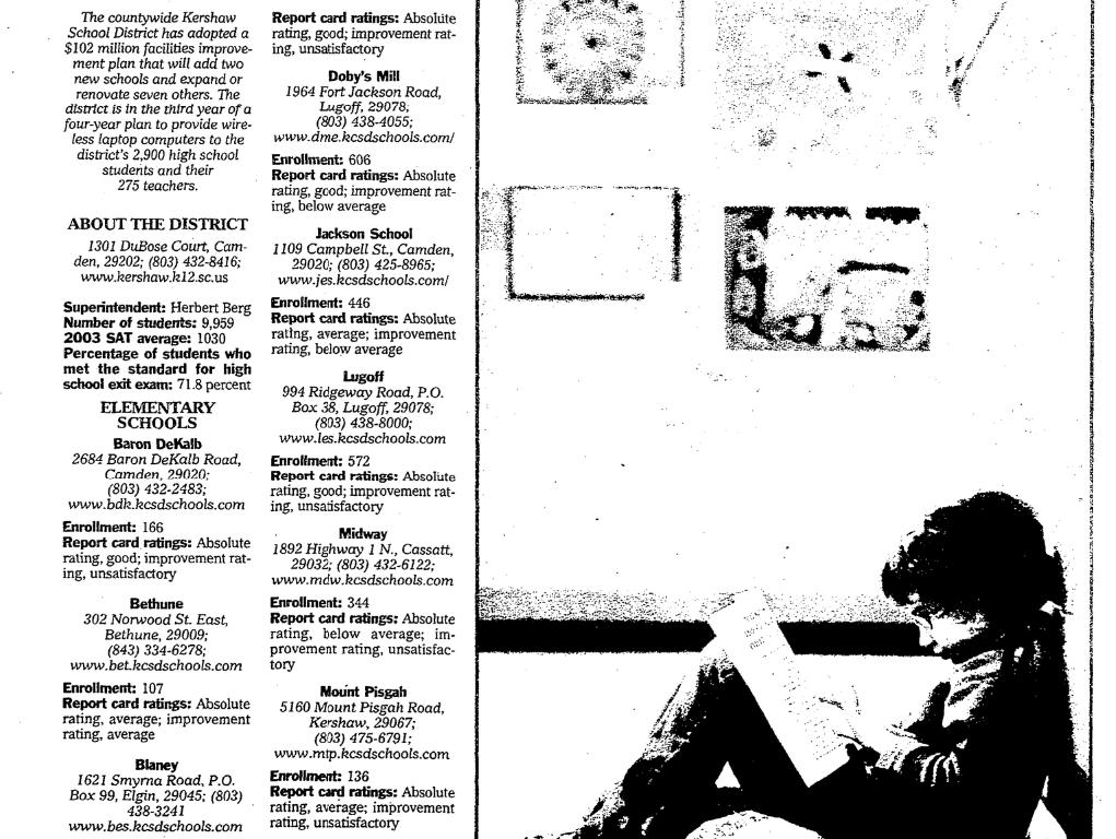 The countywide Kershaw School District has adopted a $102 million facilities improvement plan that will add two new schools and expand or renovate seven others. The district is in the third year of a four-year plan to provide wireless laptop computers to the district’s 2,900 high school students and their 275 teachers.