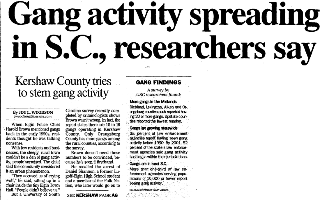 But a University of South Carolina survey recently completed by criminologists shows Brown wasn’t wrong. In fact, the report states there are 10 to 19 gangs operating in Kershaw County. Only Orangeburg County has more gangs among the rural counties, according to the survey.