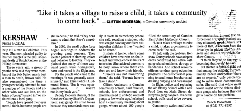 Community action and better communication among law enforcement are what leaders say they ultimately need. If there isn’t more of that, Anderson fears the drive-bys in places like Los Angeles and Atlanta will reach Kershaw County.