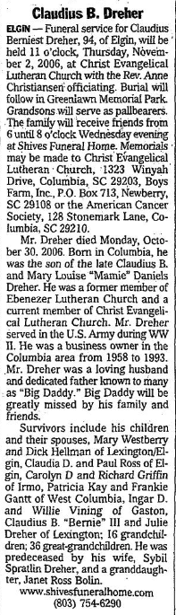 ELGIN – Funeral service for Claudius Berniest Dreher, 94, of Elgin, will be held 11 o’clock, Thursday, November 2, 2006, at Christ Evangelical Lutheran Church with the Rev. Anne Christiansen officiating. Burial will follow in Greenlawn Memorial Park. Grandsons will serve as pallbearers. The family will receive friends from 6 until 8 o’clock Wednesday evening at Shives Funeral Home. Memorials may be made to Christ Evangelical Lutheran Church, 1323 Winyah Drive, Columbia, SC 29203, Boys Farm, Inc., P.O. Box 713, Newberry, SC 29108 or the American Cancer Society, 128 Stonemark Lane, Columbia, SC 29210.