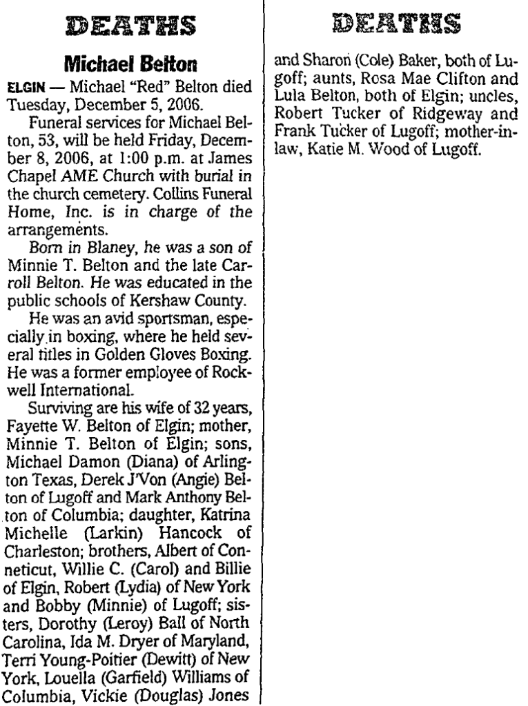 Funeral services for Michael Belton, 53, will be held Friday, December 8, 2006, at 1:00 p.m. at James Chapel AME Church with burial in the church cemetery. Collins Funeral Home, Inc. is in charge of the arrangements.