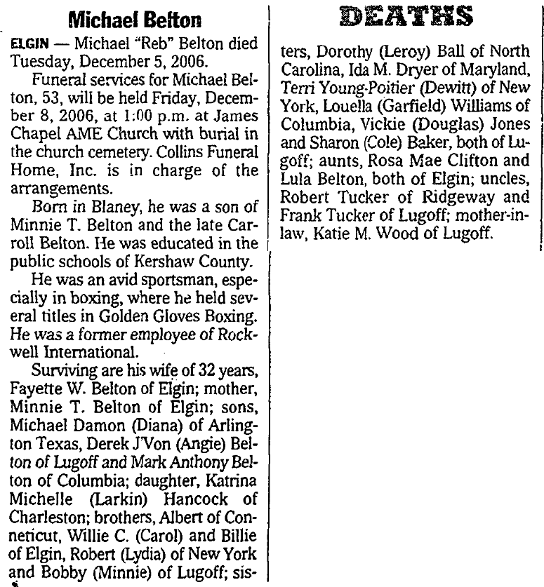 Surviving are his wife of 32 years, Fayette W. Belton of Elgin; mother, Minnie T. Belton of Elgin; sons, Michael Damon (Diana) of Arlington Texas, Derek J’Von (Angie) Belton of Lugoff and Mark Anthony Belton of Columbia; daughter, Katrina Michelle (Larkin) Hancock of Charleston; brothers, Albert of Conneticut, Willie C. (Carol) and Billie of Elgin, Robert (Lydia) of New York and Bobby (Minnie) of Lugoff; sisters, Dorothy (Leroy) Ball of North Carolina, Ida M. Dryer of Maryland, Terri Young-Poitier (Dewitt) of New York, Louella (Garfield) Williams of Columbia, Vickie (Douglas) Jones and Sharon (Cole) Baker, both of Lugoff; aunts, Rosa Mae Clifton and Lula Belton, both of Elgin; uncles, Robert Tucker of Ridgeway and Frank Tucker of Lugoff; mother-inlaw, Katie M. Wood of Lugoff.