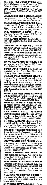 Holiday listings: SAINT MARY’S EPISCOPAL CHURCH: Hispanic ministry presents “Las Posadas,” the reenactment of Mary and Joseph’s quest for lodging in Bethlehem, followed by a Christmas Mass and party in the fellowship hall. 6 tonight. 170 St. Andrews Road, Columbia. (803) 798-2776 WESTSIDE FIRST CHURCH OF GOD: Drivethrough Christmas pageant 6-8 p.m. today. 3508 Delree St., West Columbia. (803) 796-6475 BLANEY BAPTIST CHURCH: Christmas Eve 11 a.m. worship. 1400 Blaney Road, Elgin. (803) 438-3161 GREENLAWN BAPTIST CHURCH: Candlelight communion service 7 p.m. Sunday. 6612 Garners Ferry Road, Columbia. (803) 776-4074 SHANDON PRESBYTERIAN CHURCH: 11 a.m. morning worship, 5 p.m. children’s service, 8 and 11 p.m. candlelight communion services. 607 Woodrow St., Columbia. (803) 771-4408 ENON METHODIST CHURCH: 11:15 a.m. Christmas Eve worship service. 2515 Percival Road, Columbia. (803) 609-6602 FIRST BAPTIST CHURCH: Candlelight service 6 p.m. Sunday. 415 Barr Road, Lexington. (803) 957-0686 LEXINGTON BAPTIST CHURCH: 9:30 and 11 a.m. Sunday morning worship, 5 p.m. evening service. 308 E. Main St., Lexington. (803) 359-4146 RED BANK UNITED METHODIST CHURCH: Christmas Eve candlelight and communion service 5 p.m. 2909 Old Barnwell Road, Lexington. (803) 359-4071 SECOND CALVARY BAPTIST CHURCH: 11 a.m. morning worship Sunday. 110 Mason Road, Columbia. (803) 714-9668 TRINITY BAPTIST CHURCH: Christmas Eve candlelight service, 6 p.m. 2003 Charleston Highway, Cayce. (803) 791-0440 SHANDON UNITED METHODIST CHURCH: Christmas Eve services 8:45 a.m. and 11 a.m. Children’s service featuring live nativity and music by the children’s choirs, 5 p.m. Contemporary service, 8 p.m. Communion and candlelight service with music by the Chancel Choir, 11 p.m. 3407 Devine St., Columbia. (803) 256-8383 WASHINGTON STREET UNITED METHODIST CHURCH: Morning worship services at 9 and 11 a.m. Sunday. Candlelight service 5 p.m. 1401 Washington St., Columbia. (803) 727-5611 SPRING VALLEY BAPTIST CHURCH: Morning worship service 10:20 a.m. Sunday. Candlelight and communion services, 5 and 7 p.m. 91 Polo Road, Columbia. (803) 736-0624 POND BRANCH UNITED METHODIST CHURCH: Christmas cantata “Shine on Us,” 9:30 a.m. Sunday. Candlelight service 5 p.m. 1913 Pond Branch Road, Columbia. (803) 657-5481 MT. HOREB LUTHERAN: Christmas Eve services 8:30 and 11 a.m., 5 p.m. bell service, 7 and 10 p.m. traditional service with communion. 101 E. Boundary St., Chapin. (803) 345-2000 MCGREGOR PRESBYTERIAN CHURCH: Children’s Christmas Eve Service, 5 p.m. Candlelight communion service, 7 p.m. Child-care will be available for preschool-age children. 6505 St. Andrews Road, Irmo. (803) 781-2391 NEW TESTAMENT BIBLE CHURCH: Christmas Eve day service 10:30 a.m. Featuring the violin, piano, and guitar music of Rachel and Charley Webb of Orlando, Fla. 300 Sims Ave., Columbia. (803) 237-0769 CHAPPELLE MEMORIAL AME CHURCH: “No Room at the Ritz” 9:30 a.m., “Let Heaven and Nature Sing” 10:30 a.m. Sunday. 1101 Pine St., Columbia. (803) 254-7911 FAIR LAWN UNITED METHODIST CHURCH: Christmas Eve worship service at 5 p.m., featuring guitar, flute, cello, and hammered dulcimer music. Candlelighting and worship service, 5:30 p.m. 9203 Wilson Blvd., Columbia. (803) 754-2070 KILBOURNE PARK BAPTIST CHURCH: 11 a.m. worship Sunday, 5 p.m. candlelight and communion service. 4205 Kilbourne Road, Columbia. (803) 787-3371 ST. ANDREW’S LUTHERAN CHURCH: Christmas Eve candlelight and communion services, 5 and 8 p.m. Christmas Day communion service, 10 a.m. 1416 Broad River Road, St. Andrews. (803) 772-6034 ANTIOCH BAPTIST CHURCH: Annual Christmas Day service, noon. Watch Night Service 11:30 p.m. Dec. 31. 5715 Koon Road, Columbia. (803) 786-0119 ZION MILL CREEK BAPTIST CHURCH: New Year’s Eve Celebration, 10 p.m. Dec. 31. 97 Mill Creek Parkway, Columbia. (803) 776-2250