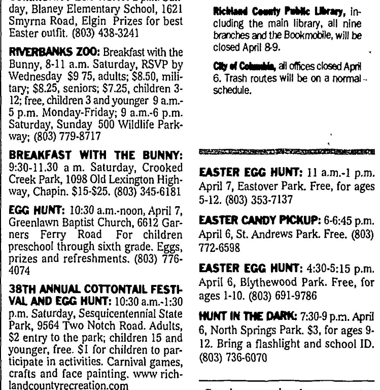 38TH ANNUAL COTTONTAIL FESTIVAL AND EGG HUNT: 10:30 a.m.-1:30 p.m. Saturday, Sesquicentennial State Park, 9564 Two Notch Road. Adults, $2 entry to the park; children 15 and younger, free. $1 for children to participate in activities. Carnival games, crafts and face painting. www.richlandcountyrecreation.com