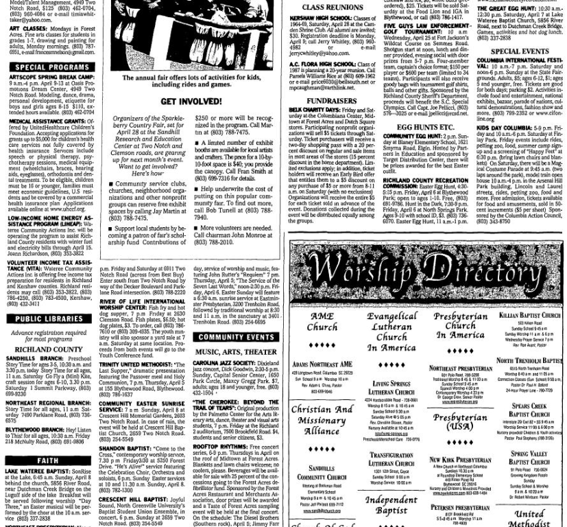 REHOBOTH UNITED METHODIST: “The Week That Changed the World,” Easter drive-through drama, 7:30-9:30 p.m. Friday and Saturday at 6911 Two Notch Road (across from Best Buy). Enter south from Two Notch Road by way of the Decker Boulevard and Parklane Road intersection. (803) 788-2220