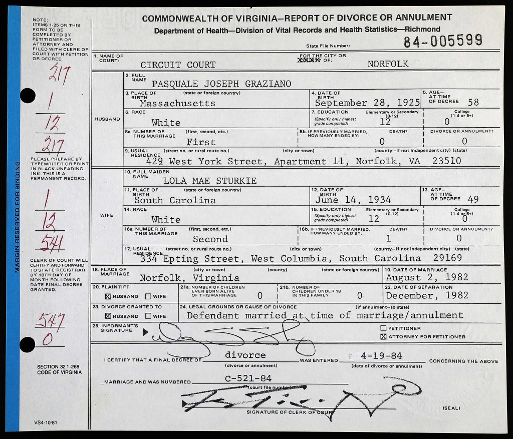 When she was 49, she divorced Pasquale Joseph Graziano, son of Joseph Graziano and Saveria Fiore, on 19 Apr 1984 in Norfolk, Virginia, USA.
