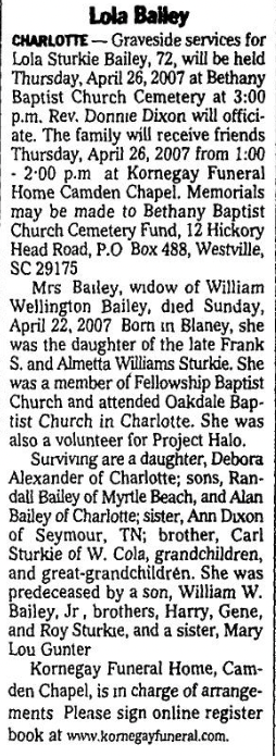 Mrs. Bailey, widow of William Wellington Bailey, died Sunday, April 22, 2007. Born in Blaney, she was the daughter of the late Frank S. Sturkie and Almetta Williams Sturkie. She was a member of Fellowship Baptist Church and attended Oakdale Baptist Church in Charlotte. She was also a volunteer for Project Halo.