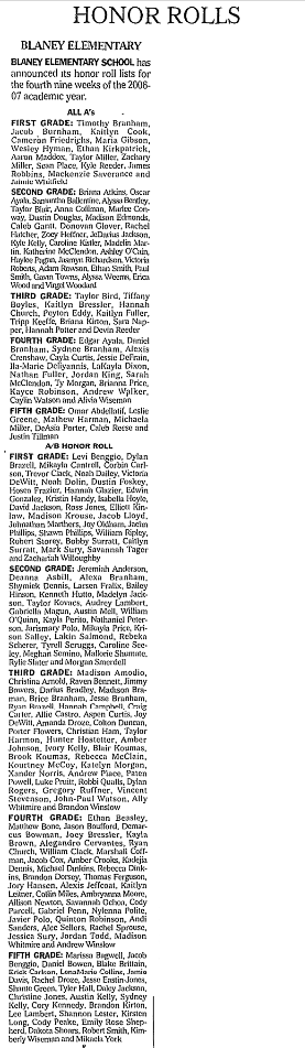 BLANEY ELEMENTARY has announced its honor roll list for the fourth nine weeks of the 2006-07 academic year.