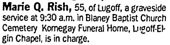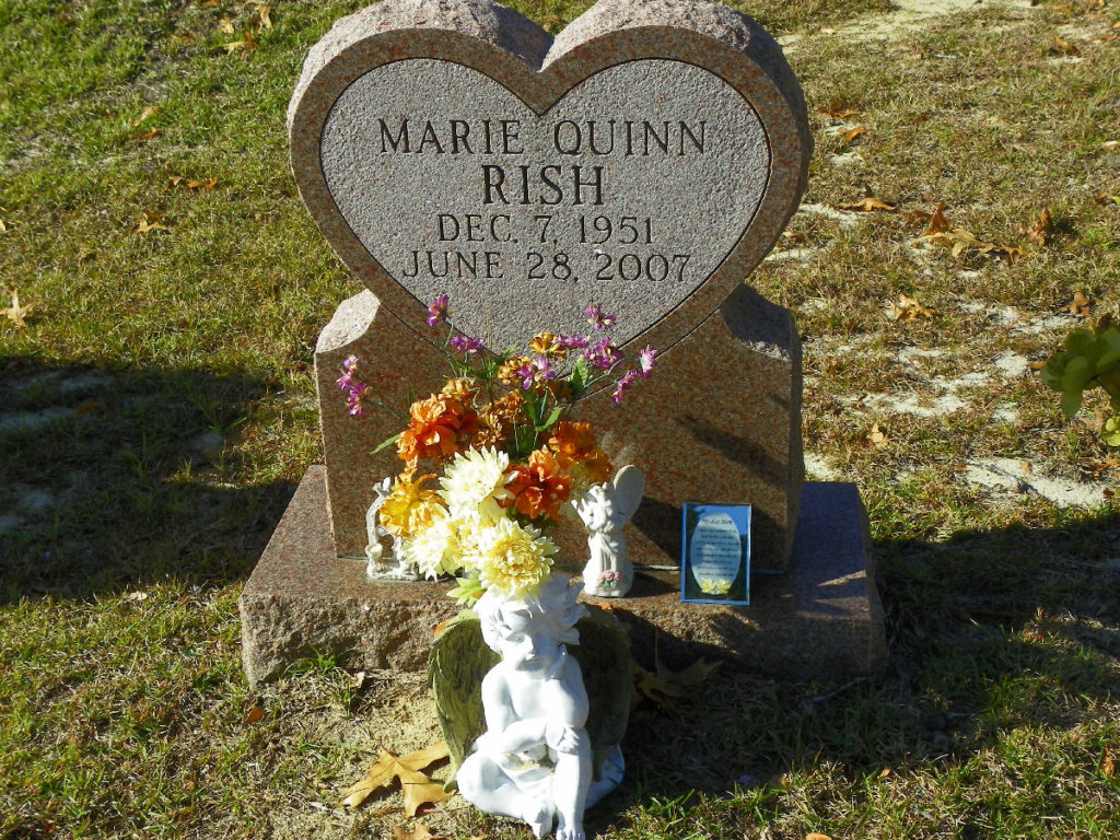 Graveside services for Marie Quinn Rish, 55, will be held Saturday, June 30, 2007 at 9:30 am at Blaney Baptist Church Cemetery. Rev. Philip Blakenship will officiate. The family will receive friends Friday, June 29, 2007 from 6:00 – 8:00 pm at Kornegay Funeral Home Lugoff – Elgin Chapel. Memorials may be made to the American Cancer Society, 128 Stonemark Lane, Columbia, SC 29210.