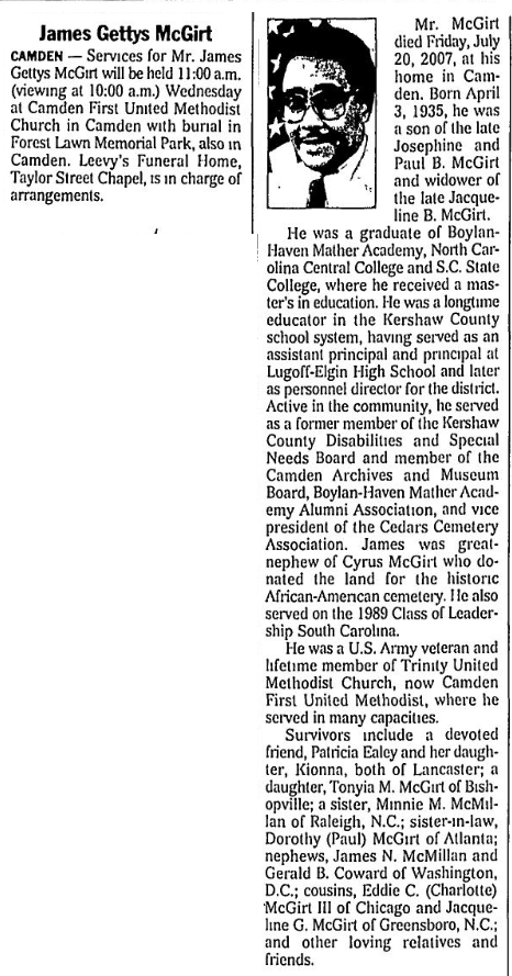 He was a graduate of Boylan- Haven Mather Academy, North Carolina Central College and S.C. State College, where he received a master’s in education. He was a longtime educator in the Kershaw County school system, having served as an assistant principal and principal at Lugoff-Elgin High School and later as personnel director for the district. Active in the community, he served as a former member of the Kershaw County Disabilities and Special Needs Board and member of the Camden Archives and Museum Board, Boylan-Haven Mather Academy Alumni Association, and vice president of the Cedars Cemetery Association. James was greatnephew of Cyrus McGirt who donated the land for the historic African-American cemetery. He also served on the 1989 Class of Leadership South Carolina.