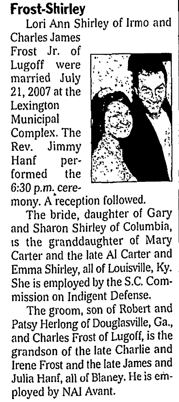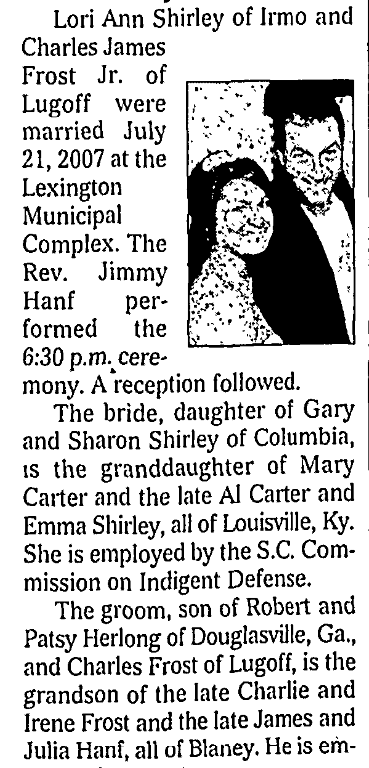 Lori Ann Shirley of Irmo and Charles James Frost Jr. of Lugoff were married July 21, 2007 at the Lexington Municipal Complex. The Rev. Jimmy Hanf performed the 6:30 p.m. ceremony. A reception followed.