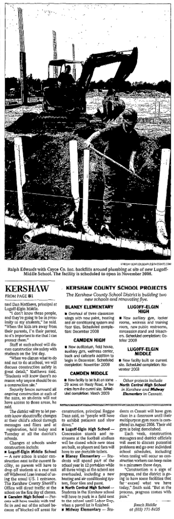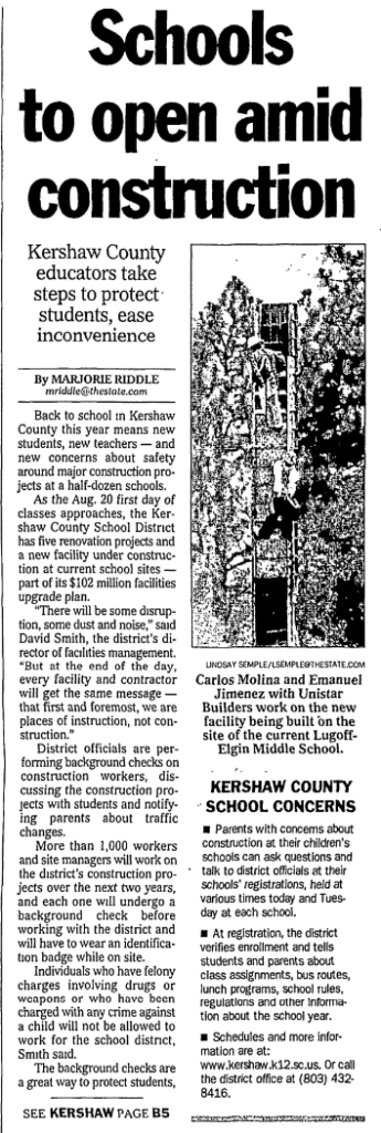 SCHOOLS TO OPEN AMID CONSTRUCTION – KERSHAW COUNTY EDUCATORS TAKE STEPS TO PROTECT STUDENTS, EASE INCONVENIENCE