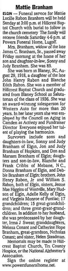 Survivors included sons and daughters-in-law, Sonny Branham and Judy Branham of Elgin, Jon and Judy Branham of Hopkins, and Don and Mariam Branham of Elgin; daughters and son-in-law, Blanche and Frank Cribbs of Mebane, N.C., Donna Branham of Elgin, and Debbie Branham of Elgin; brothers, John Henry Rabon, Jr. and William S. Rabon, both of Elgin; sisters, Jessie Mae Higgins of Westville, Mary Hudson of Elgin, Adelle Kelly of Elgin, and Virginia Monroe of Pontiac; 17 Grandchildren; 15 Great-Grandchildren; and 3 Great Great-Grandchildren. In addition to her husband, she was predeceased by her daughter, Irma J. Sweat; granddaughter, Melissa Conant; great grandson, Nicholas Conant; and sister, Helen Steadman.