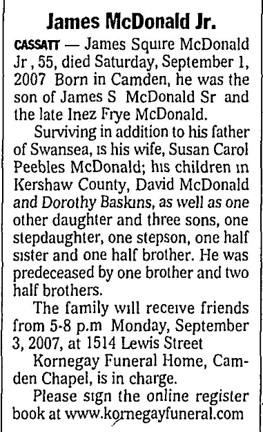 Surviving in addition to his father of Swansea, is his wife, Susan Carol Peebles McDonald; his children in Kershaw County, David McDonald and Dorothy Baskins, as well as one other daughter and three sons, one stepdaughter, one stepson, one half sister and one half brother. He was predeceased by one brother and two half brothers.