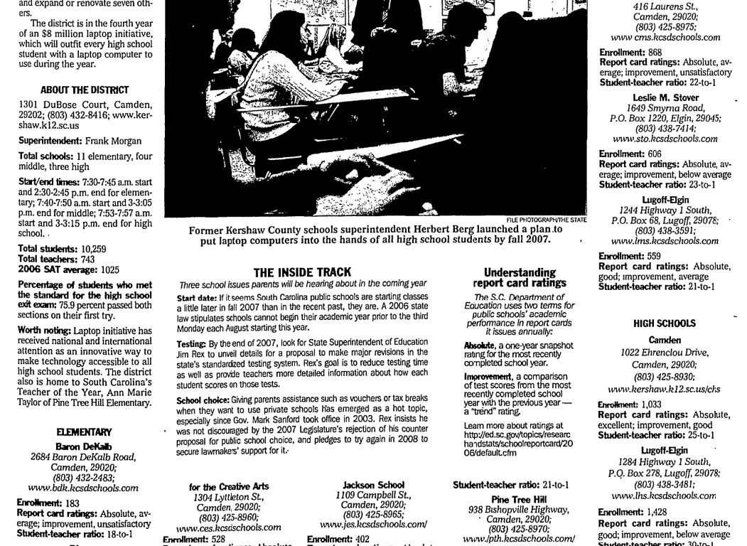 Testing: By the end of 2007, look for State Superintendent of Education Jim Rex to unveil details for a proposal to make major revisions in the state’s standardized testing system. Rex’s goal is to reduce testing time as well as provide teachers more detailed information about how each student scores on those test.
