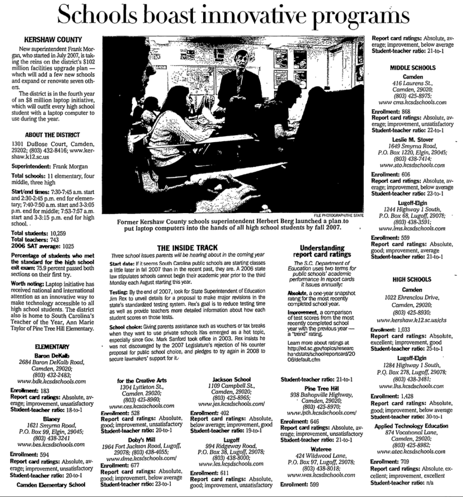 Worth noting: Laptop initiative has received national and international attention as an innovative way to make technology accessible to all high school students. The district also is home to South Carolina’s Teacher of the Year, Ann Marie Taylor of Pine Tree Hill Elementary.