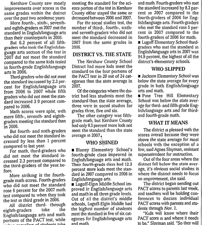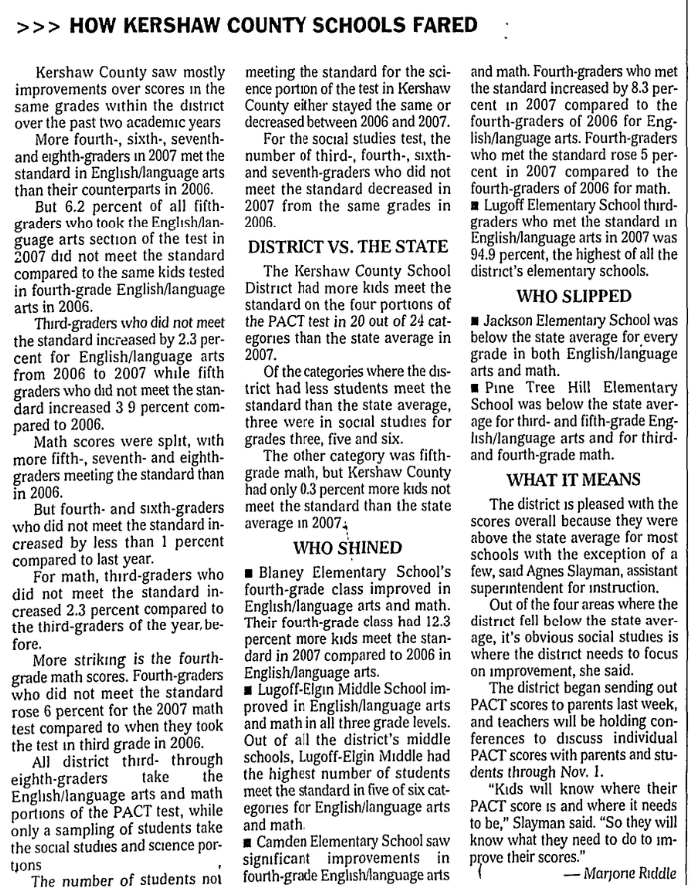 The other category was fifthgrade math, but Kershaw County had only 0.3 percent more kids not meet the standard than the state average in 2007. WHO SHINED