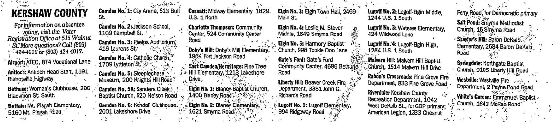 Riverdale: Kershaw County Recreation Department, 1042 West DeKalb St., for GOP primary; American Legion, 1333 Chestnut Ferry Road, for Democratic primary.