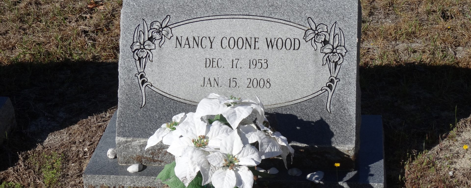 She died on 15 Jan 2008 in Lugoff, Kershaw, South Carolina, USA. Nancy Coone was buried on 19 Jan 2008 in Elgin, Kershaw, South Carolina, USA at Highway Pentecostal Holiness Church Cemetery.