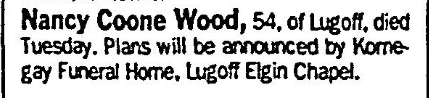 Nancy Coone Wood, 54, of Lugoff, died Tuesday. Plans will be announced by Kornegay Funeral Home, Lugoff Elgin, Chapel.