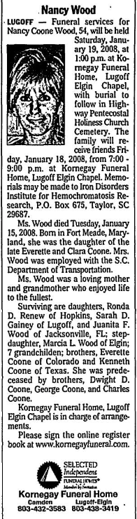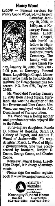 LUGOFF — Funeral services for Nancy Coone Wood, 54, will be held Saturday, January 19, 2008, at 1:00 p.m. at Kornegay Funeral Home, Lugoff Elgin Chapel, with burial to follow in Highway Pentecostal Holiness Church Cemetery. The family will receive friends Friday, January 18, 2008, from 7:00 – 9:00 p.m. at Kornegay Funeral Home, Lugoff-Elgin Chapel. Memorials may be made to Iron Disorders Institute for Hemochromatosis Research, P.O. Box 675, Taylor, SC