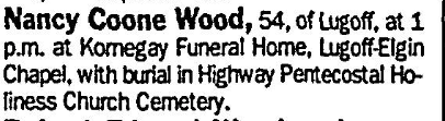 Nancy Coone Wood, 54, of Lugoff, at 1 p.m. at Kornegay Funeral Home, Lugoff Elgin Chapel, with burial in Highway Pentecostal Holiness Church Cemetery