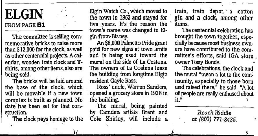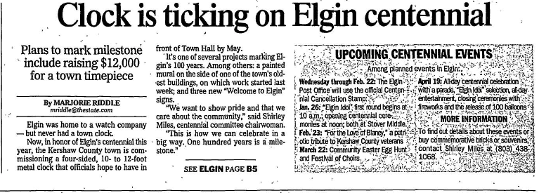Now, in honor of Elgin’s centennial this year, the Kershaw County town is commissioning a four-sided, 10- to 12-foot metal clock that officials hope to have in front of Town Hall by May.