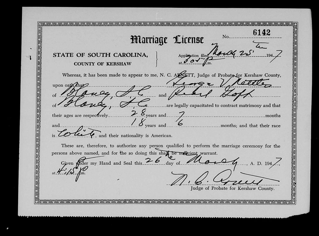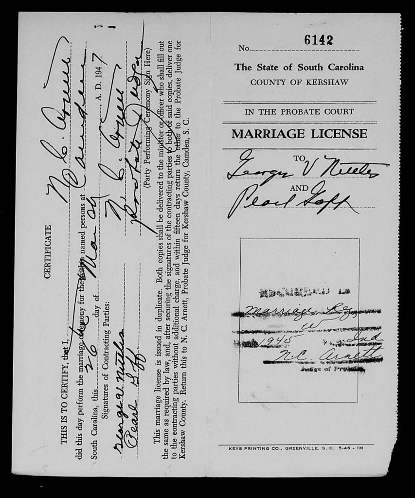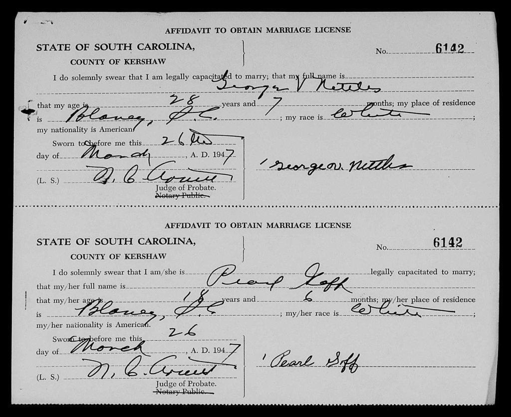 On March 26, 1947, George V Nettles (28) and Pearl Goff (18) were married in Kershaw, South Carolina.