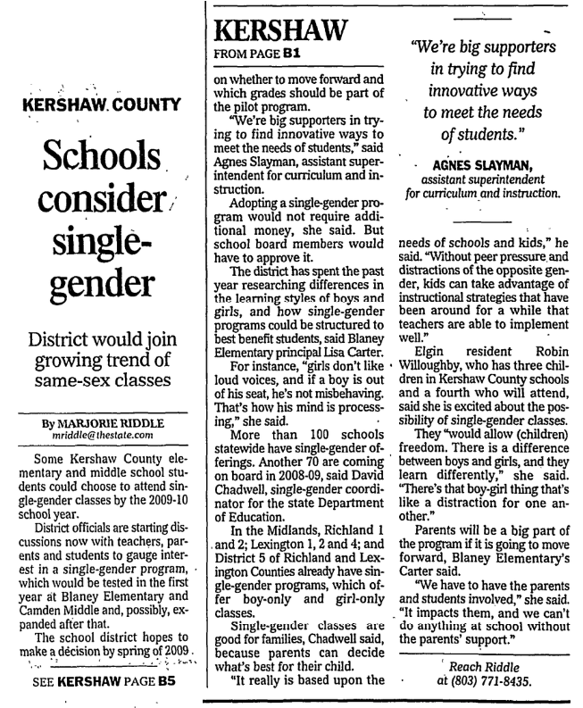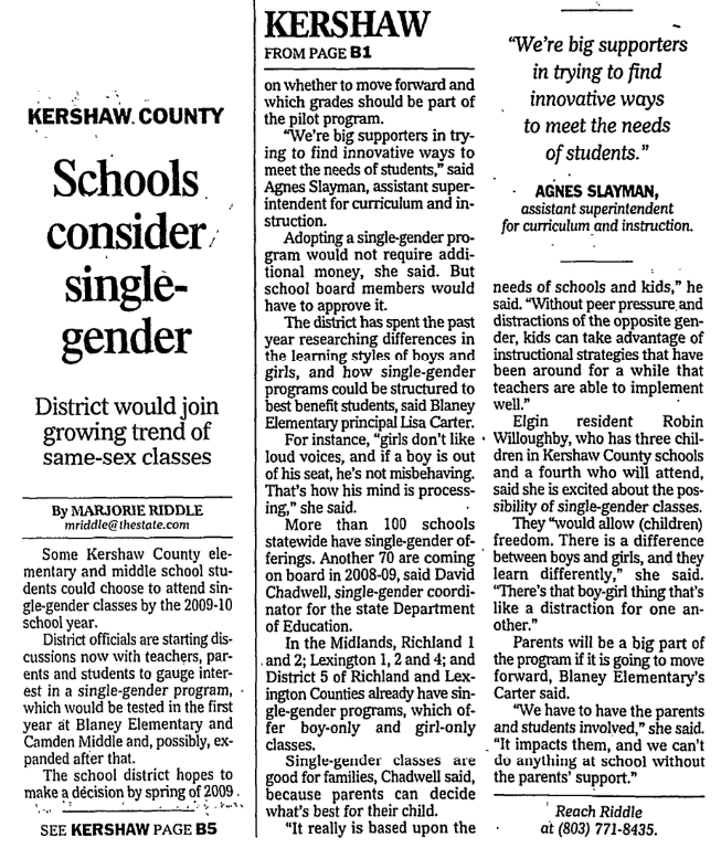In the Midlands, Richland 1 and 2; Lexington 1, 2 and 4; and District 5 of Richland and Lexington Counties already have single-gender programs, which offer boy-only and girl-only classes.