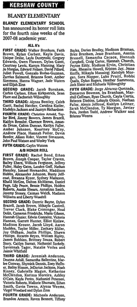BLANEY ELEMENTARY SCHOOL has announced its honor roll lists for the fourth nine weeks of the 2007- 08 academic year.