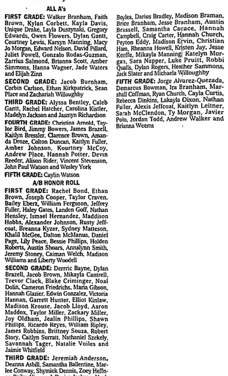 FIFTH GRADE: Jorge Alvarez-Quezada, Demarcus Bowman, Ira Branham, Marshall Coffman, Ryan Church, Cayla Curtis, Rebecca Dinkins, Lakayla Dixon, Nathan Fuller, Alexis Jeffcoat, Kaitlyn Leitner, Sara McClendon, Ty Morgan, Javier Polo, Jordan Todd, Andrew Walker and Brianna Weems.