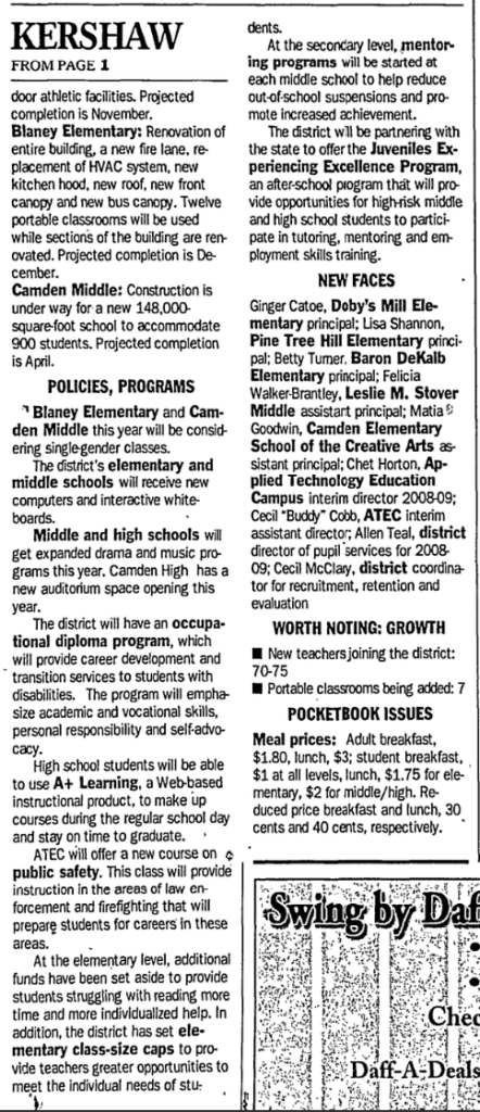 Ginger Catoe, Doby’s Mill Elementary principal; Lisa Shannon, Pine Tree Hill Elementary principal; Betty Turner, Baron DeKalb Elementary principal; Felicia Walker-Brantley, Leslie M. Stover Middle assistant principal; Matia Goodwin, Camden Elementary School of the Creative Arts assistant principal; Chet Horton, Applied Technology Education Campus interim director 2008-09; Cecil “Buddy” Cobb, ATEC interim assistant director; Allen Teal, district director of pupil services for 2008-09; Cecil McClary, district coordinator for recruitment, retention and evaluation